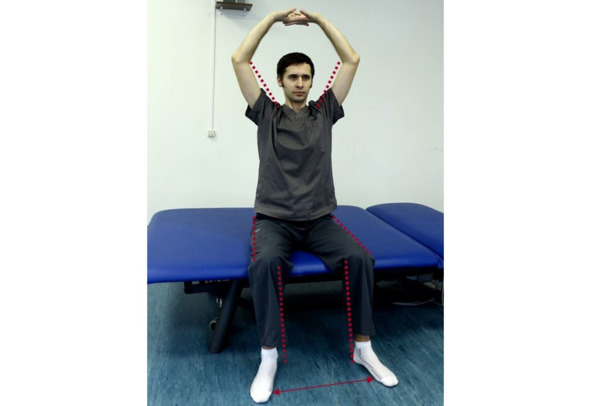 Рисунок 21. Упражнение лечебной физкультуры, используется стол для Войта-Бобат терапии: используем статичное положение «сидя», руки подняты над головой ладонями вверх, кисти сомкнуты вместе, руки слегка согнуты в локтях, ноги согнуты в коленных суставах, стопы слегка развернуты кнаружи. Удерживаем положение 10—15 сек. Выполняем 10 повторов.