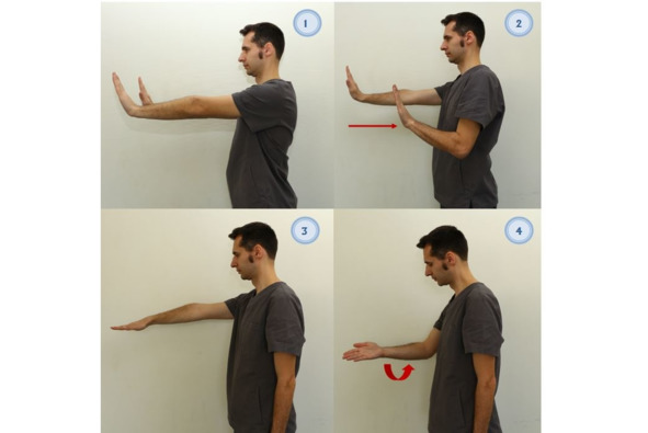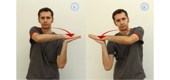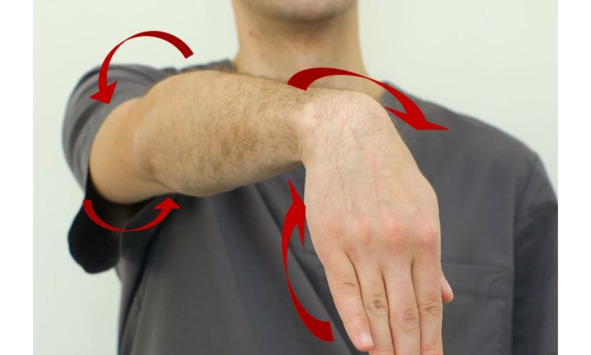 Рисунок 22. Упражнение лечебной физкультуры: исходное положение «стоя» или «сидя» с вытянутой вперед рукой – выполняем круговые вращения в плечевом суставе и в кисти поочередно по часовой стрелке и против по 5 раз в каждом направлении. Выполняем поочередно для левой и правой руки.