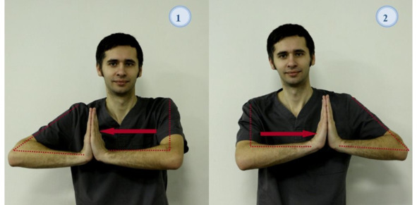 Рисунок 24. Упражнение лечебной физкультуры: исходное положение «стоя» или «сидя», ладони сложите вместе, предплечья параллельны полу; 1—2. Перемещайте ладони в одну сторону до предела и в другую, как показано на рисунке. Повторить 8—10 раз в каждую сторону.
