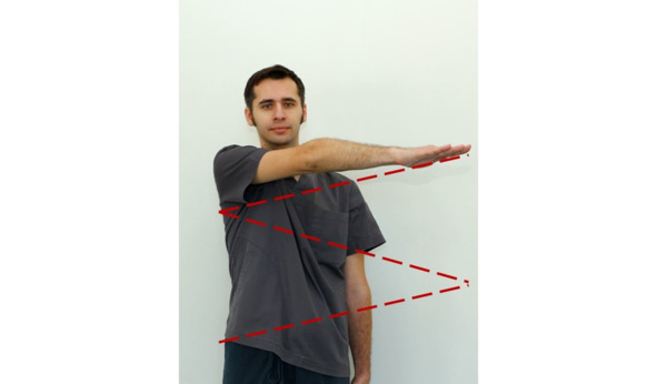 – В исходном положении стоя или сидя расположить правую руку на уровне лица со стороны (рис. 25). Выпрямленной правой рукой рисовать зигзаг, проводя линии под углом. Повторить 8—10 раз для каждой руки;