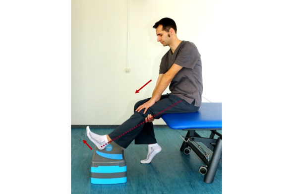 Рисунок 27. Упражнение лечебной физкультуры, используется стол для Войта-Бобат терапии, степ-платформа: исходное положение – «сидя», правая нога согнута в коленном и тазобедренном суставе, пальцы стопы с опорой на пол, левая нога выпрямлена, стопа пяткой опирается на степ платформу, левая кисть на левом коленном суставе сверху, правая кисть под левым коленным суставом. Осуществляем наклон вперед туловищем, при этом кистью помогаем выпрямить левую ногу в коленном суставе, удерживая положение на 15—20 сек. Поочередно выполняем для левой и правой ноги по 8—10 раз.