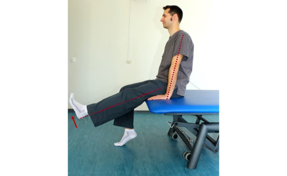 Рисунок 28. Упражнение лечебной физкультуры, используется стол для Войта-Бобат терапии: исходное положение – «сидя», нижние конечности согнуты в коленных и тазобедренных суставах, пальцы стоп с опорой на пол, поочередно выпрямляем левую и правую ногу, тянем стопу на себя, по 10 раз для каждой ноги.