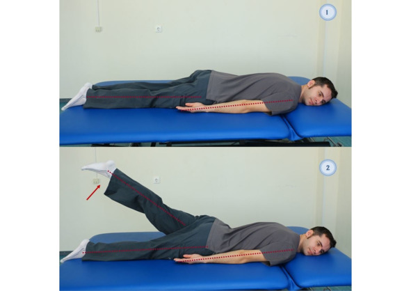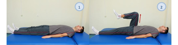 Рисунок 30. Упражнение лечебной физкультуры, используется стол для Войта-Бобат терапии: 1. Исходное положение «лежа на спине», руки вдоль туловища; 2. То же положение с согнутой в коленном суставе и поднятой правой ногой, задерживаем положение 5—10 сек. Поочередно выполняем для левой и правой ноги по 10—15 повторов.