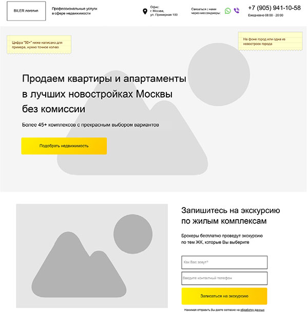 Что обычно я показываю в прототипе? Я показываю где будет находиться логотип, телефон, фотография, заголовки, блоки с товарами, преимущества, схема работы, отзывы, контакты и т. д. В общем все, что будет на странице.