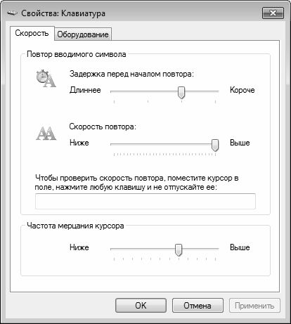 На вкладке Скорость выполняется настройка параметров, которые определяют скоростные характеристики работы клавиатуры. С помощью ползунка Задержка перед началом повтора устанавливается интервал времени, после которого начинается повтор символов при удержании клавиши нажатой. Ползунок Скорость повтора предназначен для установки требуемой скорости ввода повторных символов при удержании клавиши нажатой. При этом в расположенном ниже поле можно проверить установленную скорость. С помощью ползунка Частота мерцания курсора можно увеличить либо уменьшить частоту мерцания курсора. Выбранный режим наглядно демонстрируется слева от ползунка.