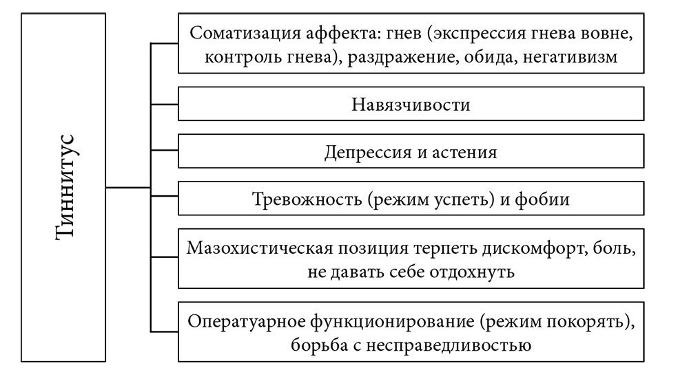 В повседневной практике я замечаю, что тиннитус возникает как реакция на сильный стресс с последующими трудностями в адаптации или реадаптации. Эта реакция может проявляться в форме острой реакции на стресс, ПТСР, соматоформного, соматизированного расстройства, ипохондрии, инсомнии или протекать в структуре различных состояний (см. рис. 2) и часто в рамках обсессивно-компульсивного расстройства.