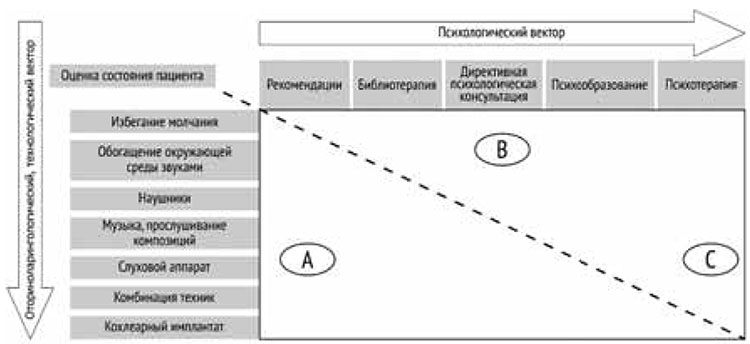 На рисунке 3 показан матричный подход В. Набли (matrix approach) к лечению пациента с тиннитусом, в зависимости от клинико-психологических потребностей пациента, объединяющий психологические и медицинские аспекты.