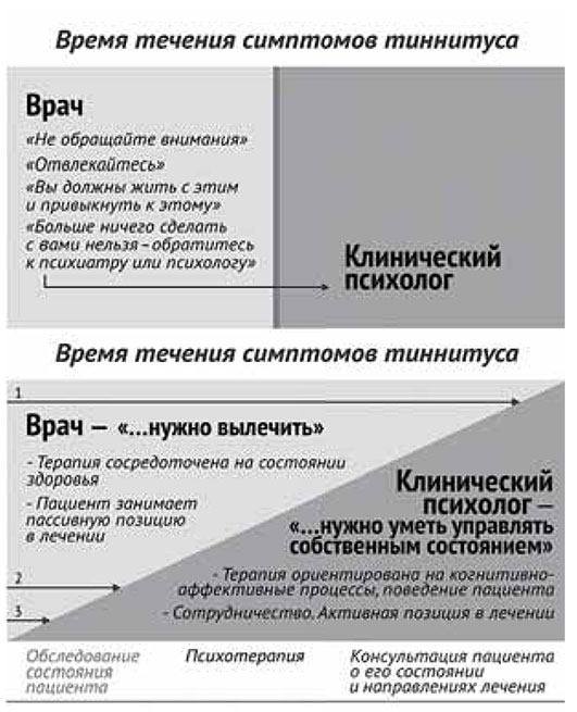 Важной причиной неудовлетворительных результатов помощи таким пациентам является ограниченность знаний врачей-неврологов, оториноларингологов и других специалистов о ведении больных с ушным шумом с учетом их психических фенотипов, что диктует необходимость более широкого внедрения психотерапевтических методов лечения. На сегодняшний день во всем мире используют практику консультирования пациентов, когда врач объясняет возможные причины шума в ушах и развеивает тревожные мифы и домыслы больного.