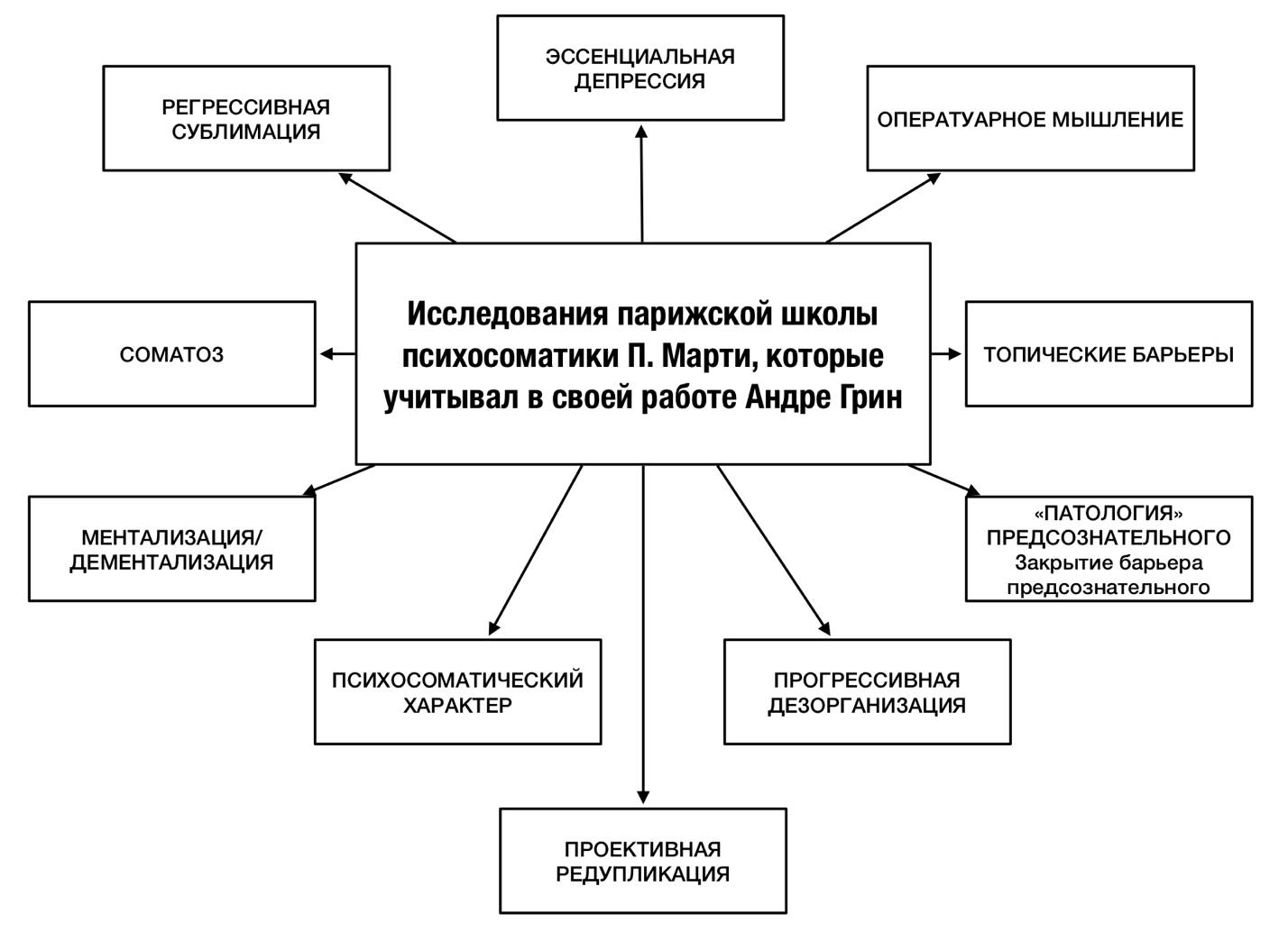 Рис. 1 Исследования (концептуальный аппарат) парижской школы психосоматики П. Марти, которые учитывал в своих работах А. Грин
