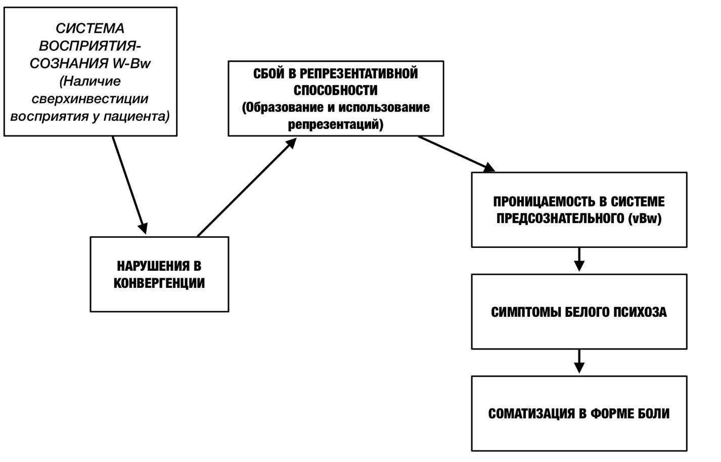 На начальном этапе соматизации у пациента А. Грин устанавливает изменения у него в восприятии и устанавливает следующую цепочку (рис.2).