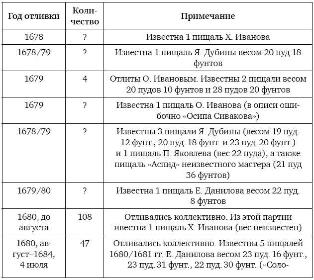 К сожалению, пока нельзя полностью восстановить все факты изготовления этих орудий на Пушечном дворе. Тем не менее архивные документы (описи 1694–1695 гг., «Записная книга Пушкарского приказа 1700 г.», акты 1680-х гг. и др.) позволяют выявить отдельные моменты массового производства.