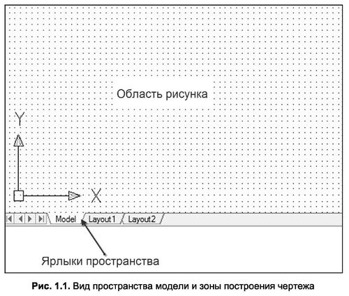 После запуска программы вам будет представлено пространство Model (Модель), предназначенное для выполнения всех графических построений и редактирования, а также еще два пока не подготовленных пространства листа, предназначенных для обработки документа перед печатью (рис. 1.1).