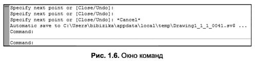 Нижняя часть экрана, где расположено приглашение системы в форме Command, представляет собой область, посредством которой в основном происходит диалог пользователя с системой. Здесь отображаются вводимые пользователем команды и ответы (или вопросы) AutoCAD. Последняя строка окна команд, содержащая приглашение Command, называется командной строкой (или строкой подсказки).