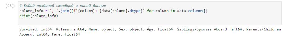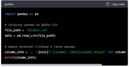 Кроме того, мы рекомендуем напоминать ChatGPT о том, какие названия столбцов у нас есть в датасете, и какого они типа. Это поможет нам точнее работать со столбцами в нашем датасете. Для этого мы можем попросить ChatGPT вывести названия столбцов и их типы в одну строку, которую мы сможем скопировать и использовать для конкретизации наших последующих запросов.