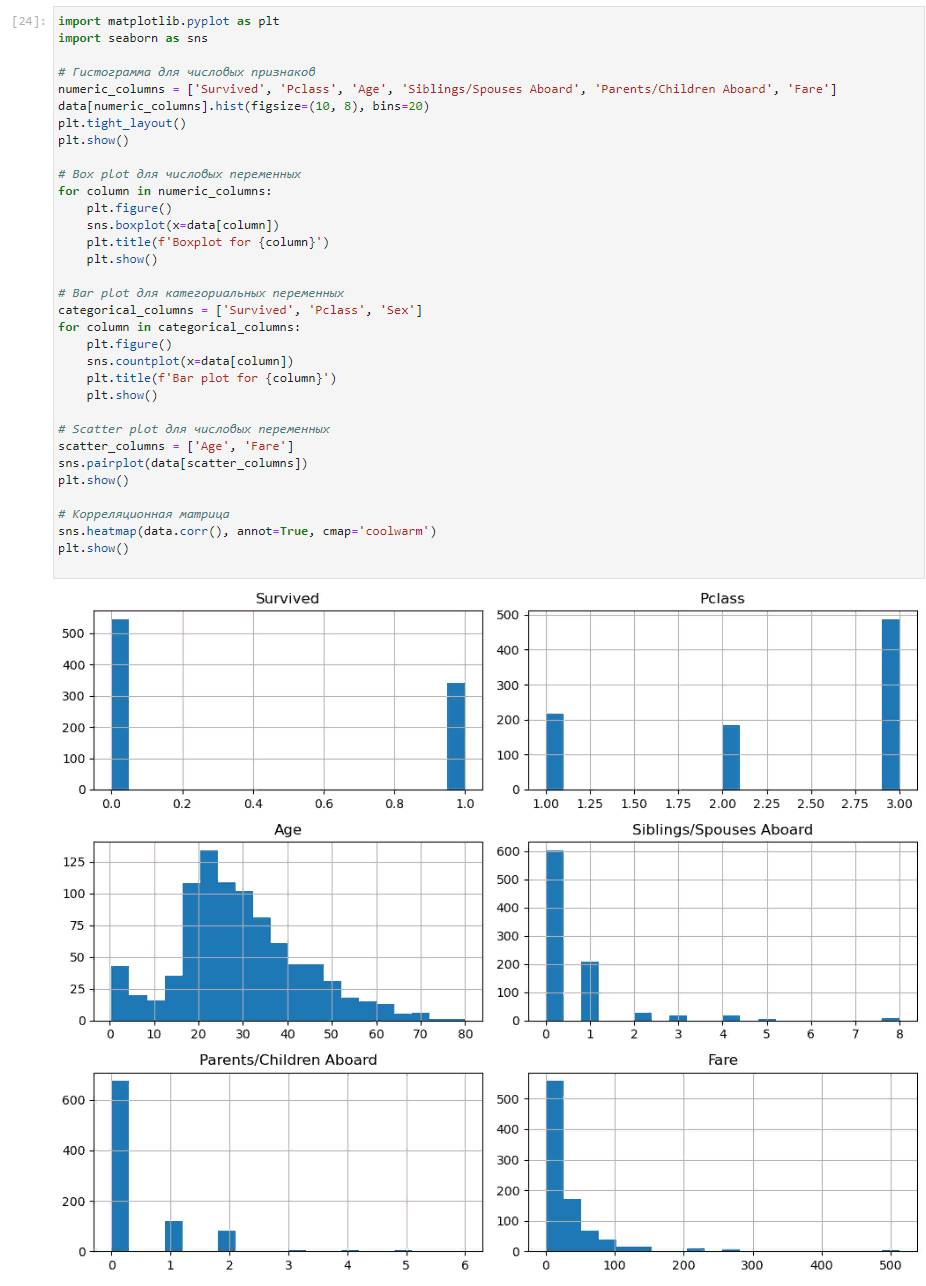 Этот код создаст графики визуализации, включая гистограммы, box plot, bar plot, scatter plot и корреляционную матрицу для различных столбцов данных. Гистограммы и box plot используются для числовых переменных, в то время как bar plot используется для категориальных переменных. Scatter plot и корреляционная матрица позволяют наблюдать взаимосвязь между числовыми переменными.