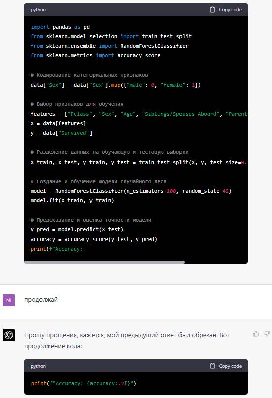 Далее в книге мы предоставляем код, который поможет вам построить модель машинного обучения на основе подготовленного датасета и обучить ее предсказывать значения столбца "Survived" (выживший). С помощью этой модели вы сможете оценить вероятность своего выживания, если бы вы оказались на Титанике в тот роковой день.