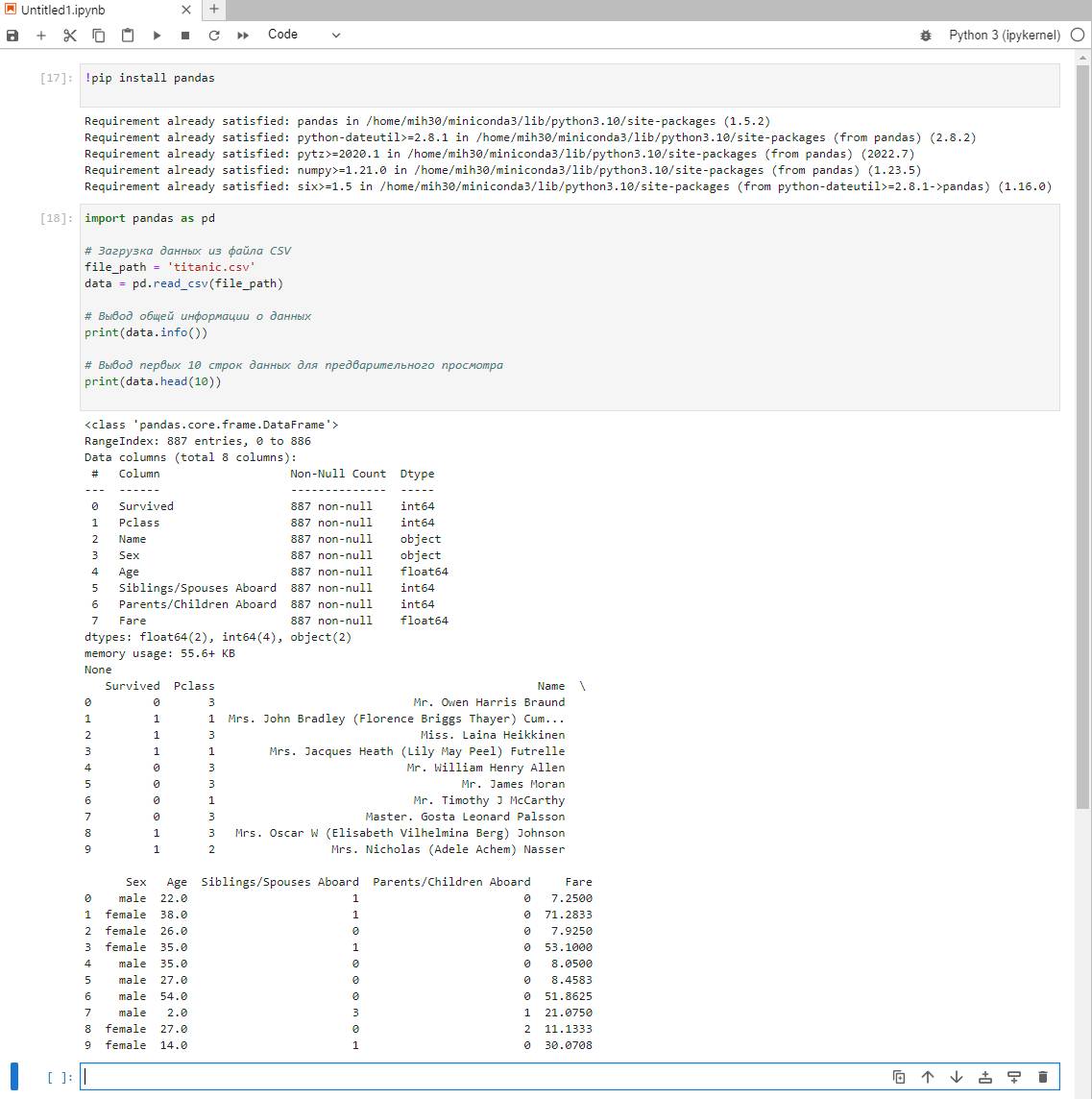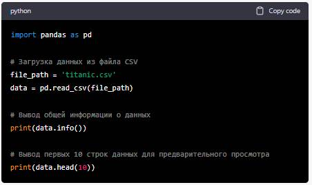 Учтите, что вам нужно будет заменить 'titanic.csv' на действительный путь к файлу CSV на вашем компьютере или URL-адрес файла, если он доступен онлайн.