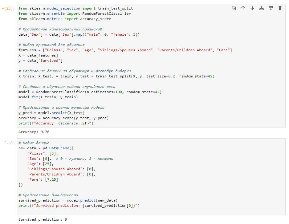 Теперь, когда модель обучена, вы можете использовать её для предсказания выживаемости на новых данных.