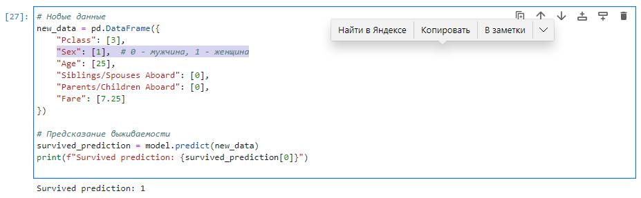 Давайте попробуем сделать изменения в коде самостоятельно, без запросов в ChatGPT. Мы заменим значения для предсказания на свои собственные, вместо мужчины мы подставим женщину, а все остальные параметры оставим без изменений.