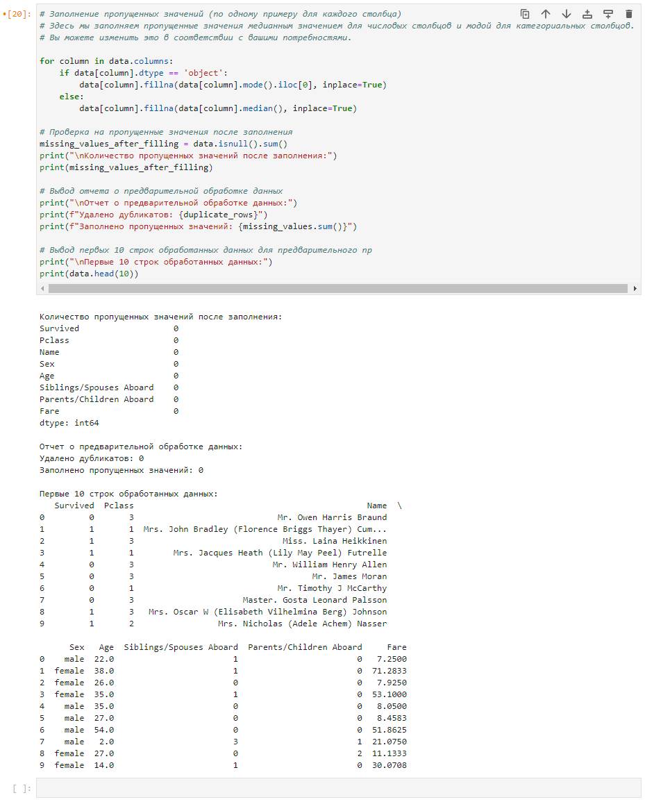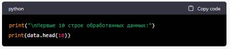 После выполнения этого кода вы получите отчет о предварительной обработке данных, включая количество удаленных дубликатов и заполненных пропущенных значений. Код также выводит первые 10 строк обработанных данных для предварительного просмотра.