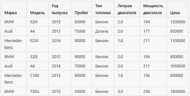 В этом примере каждая строка представляет автомобиль, а столбцы содержат информацию о его марке, модели, годе выпуска, пробеге, типе топлива, литраже двигателя, мощности двигателя и цене.