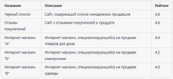 В этом примере каждая строка представляет собой результат поиска, а столбцы содержат информацию о названии, описании и рейтинге соответствующего результата.
