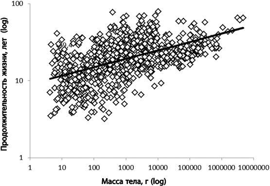 Рис. 5. Зависимость между массой тела позвоночных животных и максимальной продолжительностью жизни вида