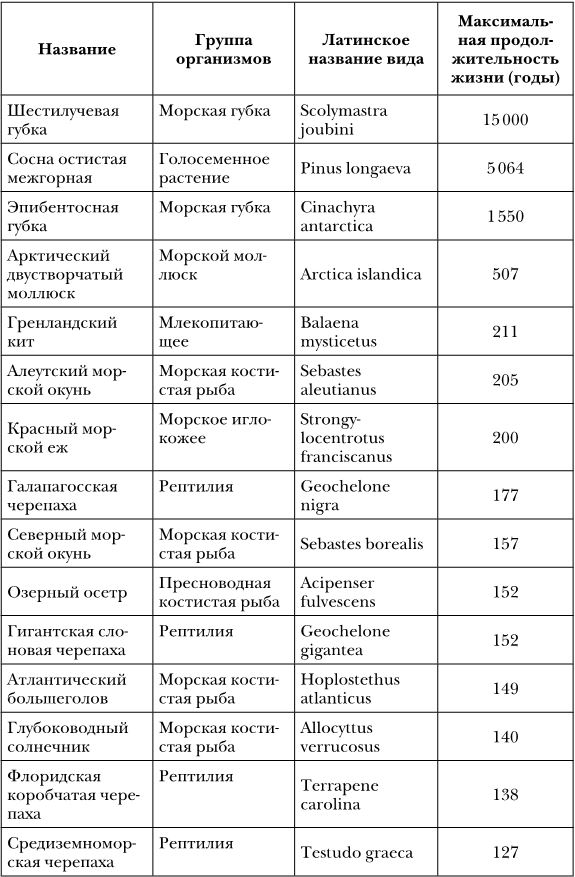 Итак, познакомимся со списком животных-долгожителей, чьи рекорды нам предстоит побить с помощью достижений науки (табл. 1).