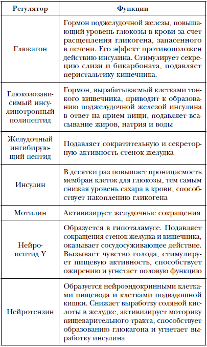Гормональная регуляция пищеварения – это сложнейший механизм, в котором участвуют множество биологически активных веществ (таблица 1). Одни из них выделяются непосредственно клетками пищеварительного тракта, вторые поступают из других органов. Когда пища поступает в пищеварительную систему, растяжение стенок и изменение химического состава содержимого активируют специальные клетки, выделяющие гормоны.