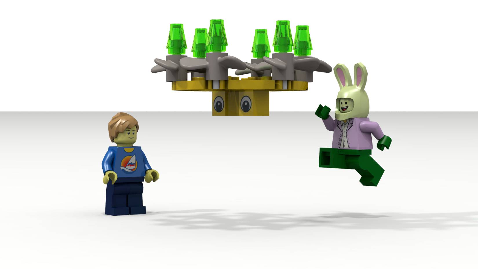 И тут… квадрокоптер вдруг мигнул сразу всеми лампочками. Пропеллеры закрутились, и он поднялся в воздух. Озорные глазки смотрели то на Севу, то на Кварха. Квадрокоптер замигал зелёными лампочками и начал быстро кружиться вокруг них в воздухе, приглашая поиграть.