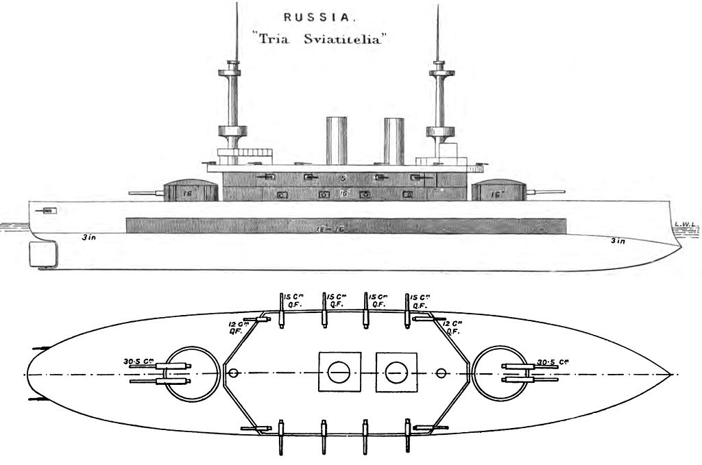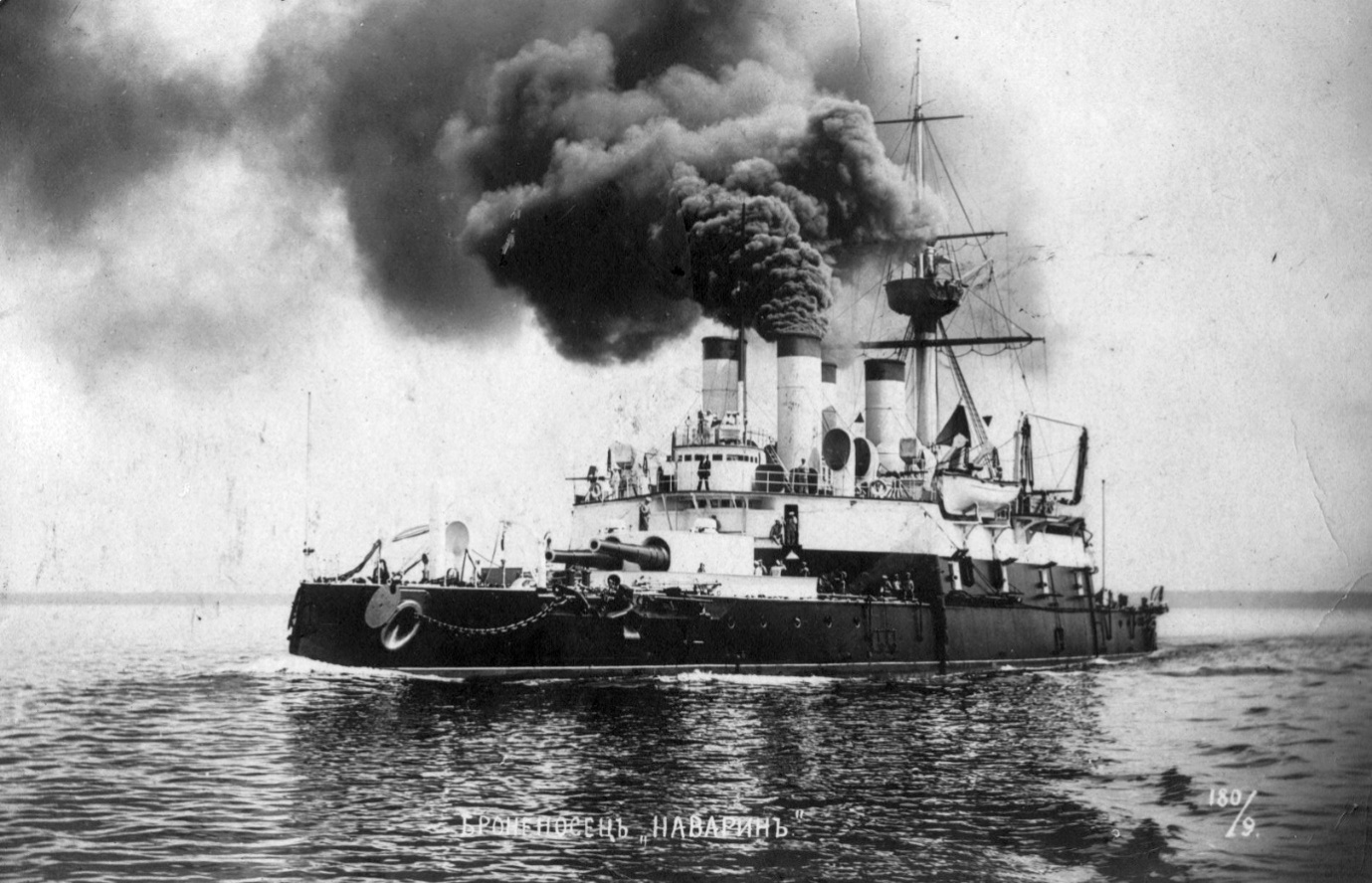 Броненосец «Наварин». Водоизмещение: 10 206 тонн, 105,9 х 20,4 х 8,4 метра. Бронирование: Пояс по ватерлинии до 16-дм, верхний пояс 12-дм, каземат 5-дм и 6-дм, палуба 2-дм и 3-дм, башни 12-дм, рубка 10-дм. 2 вертикальных паровых машины тройного расширения, 12 цилиндрических котлов, 9144 л/с, 2 винта. Скорость хода 15,85 узла. Экипаж 26 офицеров и 596 матросов. Вооружение 4 × 12-дм/35-кал орудия, 8 × 6-дм/35-кал орудий, 14 × 47-мм орудий, 12 × 37-мм орудий, 2 × 63,5-мм десантных орудия, 6 × 381 мм торпедных аппаратов