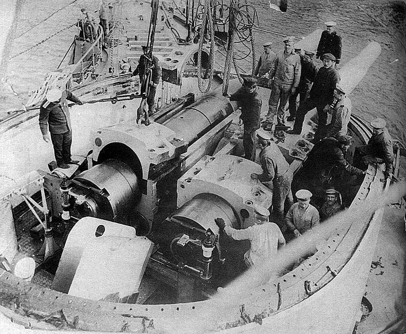 12"/40 пушки на броненосце «Цесаревич». (Вес ствола с затвором 42,8-44,2 тонны, снаряд 331,7 килограмм*792м/с=104 мДж, в бронебойном 5,3кг ВВ, в фугасном 12,4, дальность 80 кабельтовых. В 1911 году появился весом 470,9 килограмма*700м/с=115,3 мДж, в бронебойном 12,84кг ВВ, в фугасном 61,5кг)