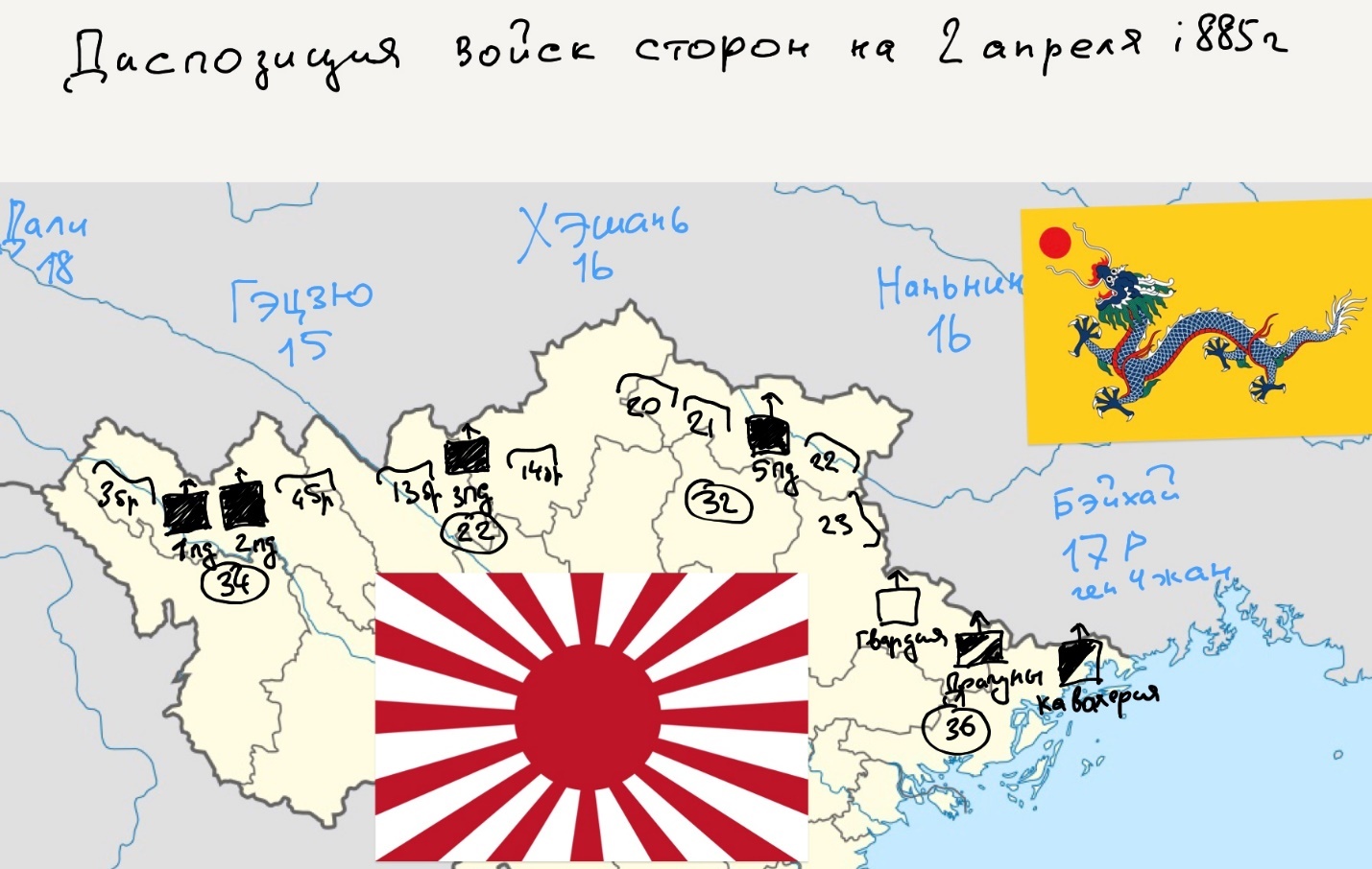 – Уже отдан приказ, о перебазировании сюда в Аннам из метрополии частей кавалерийской и драгунской дивизий, которые обеспечат наши фланги, – ответил Ямагата. – Центру наших войск наступать запрещаю. Оставим там бригады туземных войск, а наступление развернем на правом и левом флангах. Левый фланг дополнительно усилим 1-й и 2-й пехотными дивизиями – элитой нашей армии.