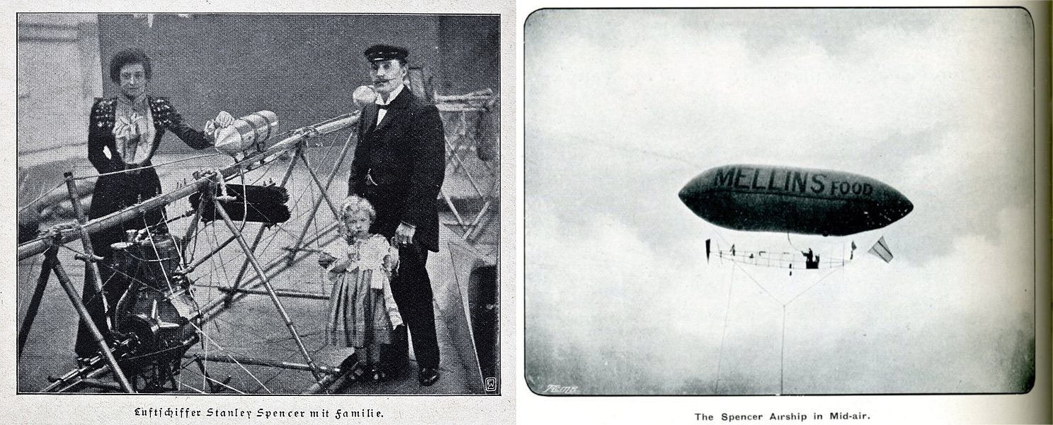 Бензиновый двигатель первого дирижабля фирмы Simms, обладал мощностью 3,5-лошадиных сил или 2,6 кВт. На борту было место только для одного человека. Двигатель приводил в движение деревянный пропеллер, работавший в конфигурации тянущего винта; предыдущие дирижабли использовали конфигурацию винта – толкателя, который, будучи установлен сзади, подвергал риску всю конструкцию и мог воспламенить любой выходящий газ. Вентиляторный насос и клапан, сконструированные Спенсером, заменяли любой потерянный газ воздухом, чтобы предотвратить деформацию оболочки дирижабля. Еще одна особенность безопасности заключалась в том, что в случае катастрофического отказа оболочки, по утверждению Спенсера, она была спроектирована так, чтобы сжаться в форму парашюта. Первый дирижабль Спенсера в полете, демонстрирующий рекламу "Mellin's Food" Сообщалось, что готовый дирижабль совершил свой первый полет где-то в конце июня 1890/1902 года. Затем последовала серия пробных полетов на поле для игры в поло Кристал Пэлас. 14 июля дирижабль пилотировала жена Спенсера, Роуз, в полете с двигателем по кругу вокруг земли, «под полным контролем», согласно одной из газет. Если различные сообщения прессы об этом событии верны, это делает миссис Спенсер первой женщиной, пилотирующей дирижабль с двигателем. Хотя Спенсер спроектирован как одноместный аппарат, он летал со своей трехмесячной дочкой Глэдис, по крайней мере один раз, утверждая, что она была первой женщиной, совершившей полет на дирижабле. А раз изобретатель брал в полет свою дочку, то в надежности он не сомневался.