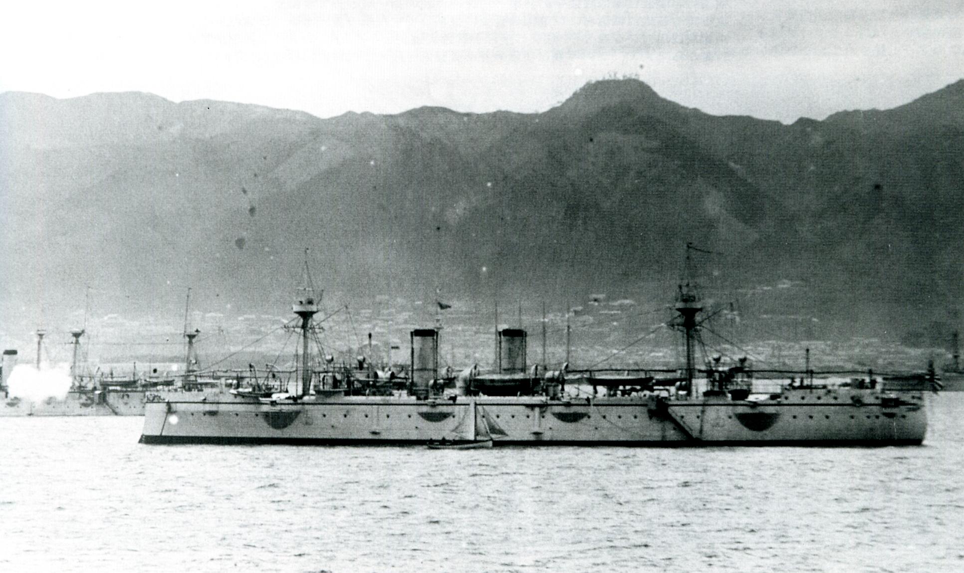 Крейсер «Акицусима» в Кобе в 1897 году (3150 тонн, 91,7х13,14х5,32 метра, бронепалуба 3-дм скосы и 1-дм горизонт. 2ПМ и 6 котлов, 8400 л/с, 19 узлов, 330 чел., четыре 6-дм и шесть 4,7-дм орудий, четыре 356-мм ТА).
