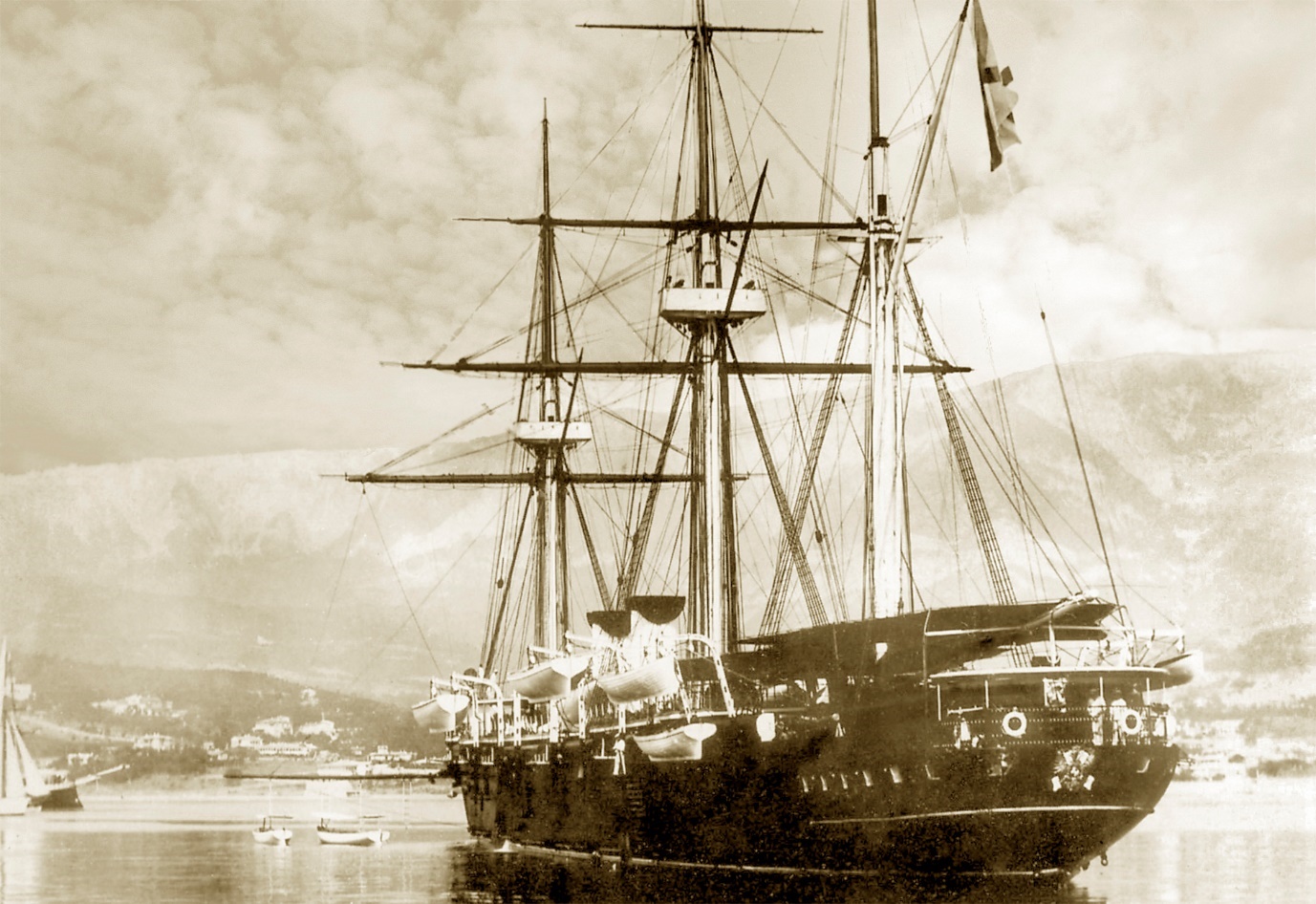 Крейсер «Адмирал Корнилов» в Пирее, 1891 год (5880 тонн, 112,8х14,8х7,8 метра, палуба до 2,5-дм, 2ПМ и 8 котлов, 6580 л/с, 17,6 узла, 5000 миль, 481 человек, четырнадцать 6-дм/35-кал орудий, шесть ТА).