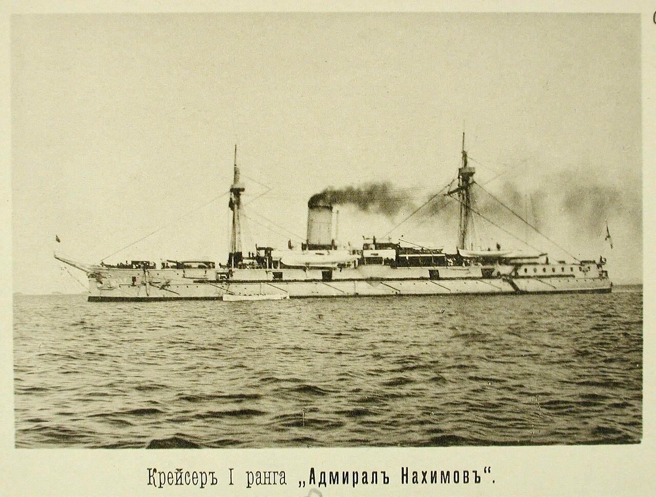 Чифу. Крейсер "Адмирал Нахимов" 26 апреля 1895 г (8473 тонны, 101,3х18,6х8,3 метра, броня «компаунд» борт 10-дм, барбеты 8-дм, 2ПМ и 12 котлов, 7768 л/с, 16,7 узла, восемь 8-дм/35-кал, десять 6-дм/35-кал, 20-мелких, три 381-мм ТА).