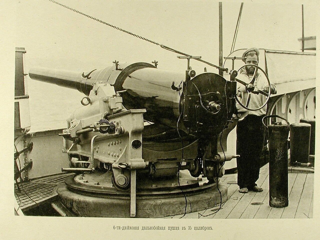 Чифу. Матрос у 6-дюймовой (152мм) пушки на палубе крейсера "Адмирал Корнилов", 1895 год. Именно такие орудия с ручным наведением и заряжанием стреляли и получали удары. (Вес ствола с затвором 6,3 тонны, снаряд 56кг*578м/с=9,3мДж или 41,5кг*710м/с*10,46мДж, дальность 48 кабельтовых, скорострельность – один выстрел в минуту)