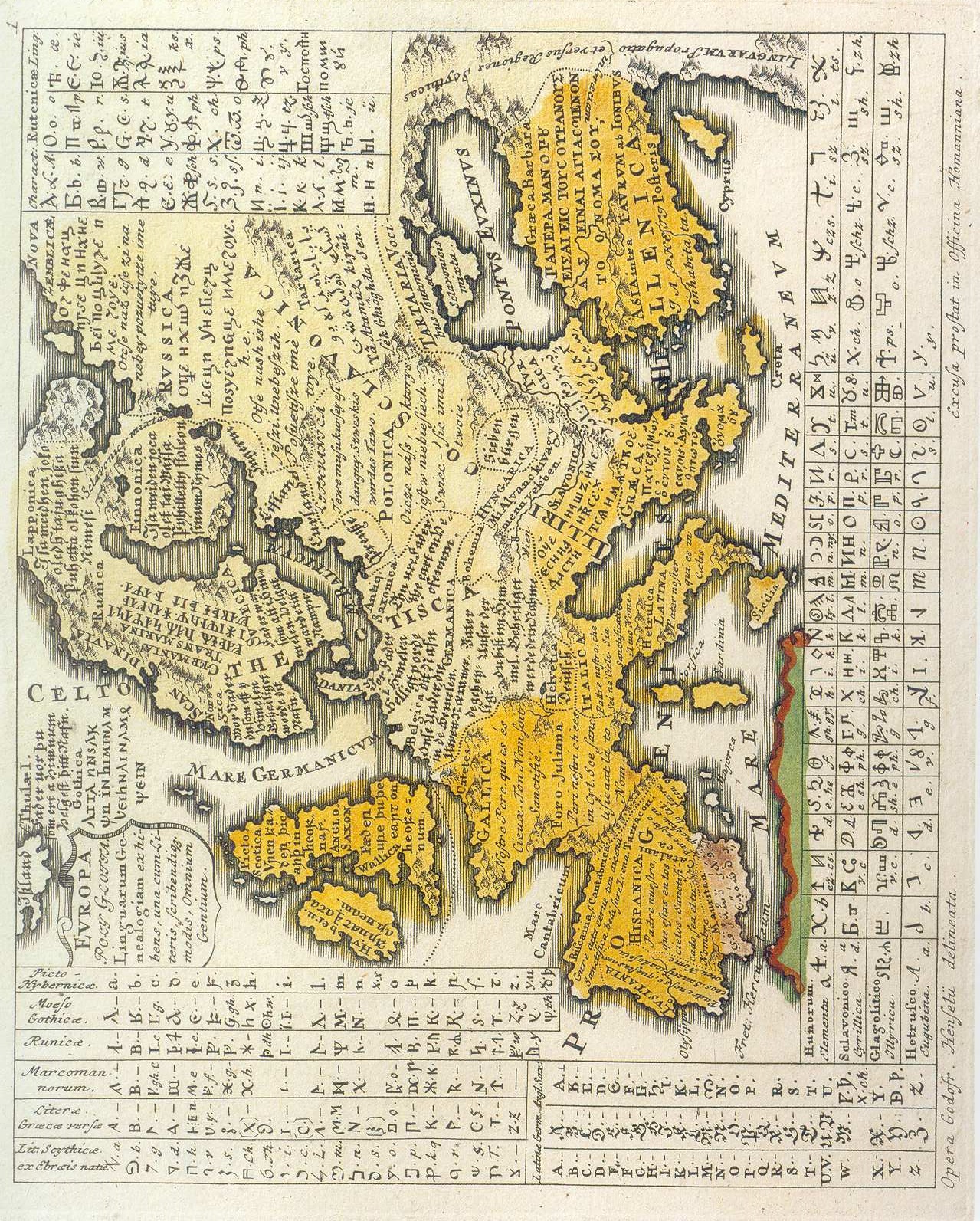 Многоязычная Европа, показывающая генеалогию языков вместе с алфавитами и способами письма всех народов." Вокруг карты расположены схемы "скифского "(на основе древнееврейского), греческого," Маркоманского", рунического, Гибернийского (островного), немецкого (черносотенного), англосаксонского," русского "(кириллического)," гуннского "(Секельско-венгерского Роваса)," Склавонского " (кириллического), глаголического и этрусского алфавитов. На карте изображена первая(две) фраза (ы) из pater noster ("Отче наш, сущий на небесах. (да святится имя твое.) ") на 33 языках.