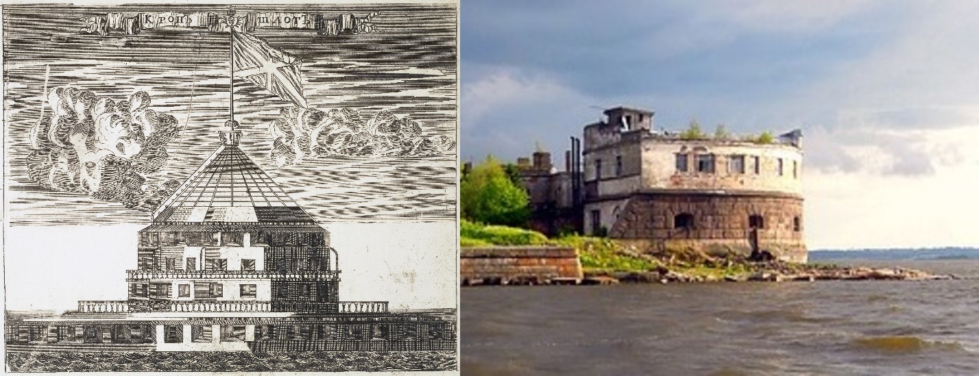 Первый форт Петербурга – Кроншлот при строительстве (Ростовцев Алексей Иванович, гравюра) и современное состояние.