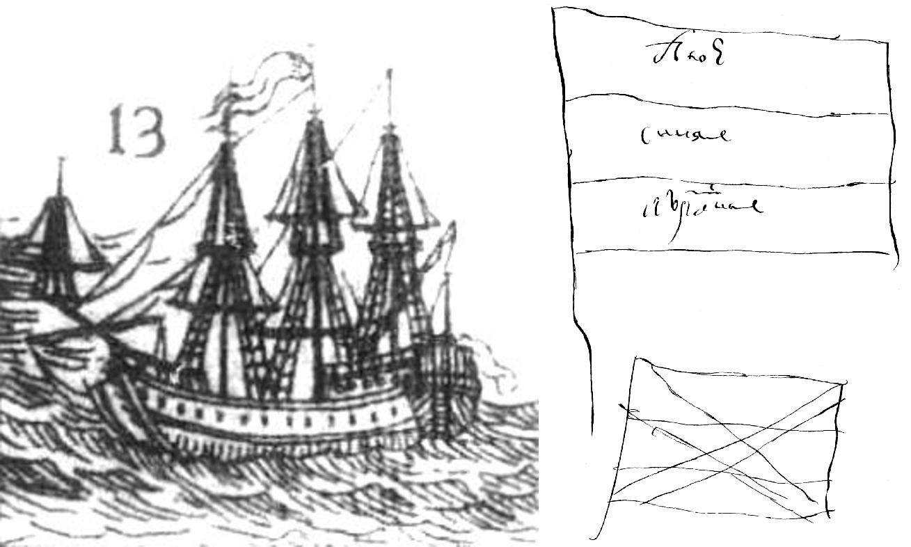 Линейный корабль "Святая Екатерина" (с гравюры Пикарта, 1716) и Проекты морских флагов, сделанные лично Петром I.