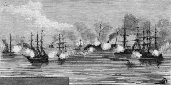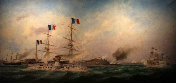 Броненосец «Баярд» у Пескадорских островов. Худ. Эдуар Адам, 1885 г.
