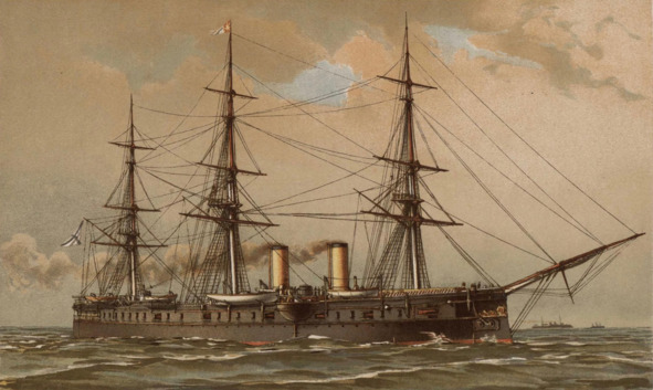 1) двухтрубный броненосец с двумя боевыми мачтами и одной барбетной носовой установкой главного калибра;