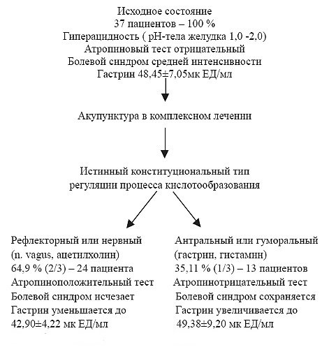 Предлагаемый нами метод двукратного определения состояния кислотообразующей функции с проведением комбинированного консервативного лечения с использованием акупунктуры позволяет выявить истинный тип регуляции процесса кислотообразования (≈2/3 вагальный или рефлекторный и ≈1/3 антральный или гуморальный из всей группы атропиноареактивности в исходном состоянии) (табл. 3).