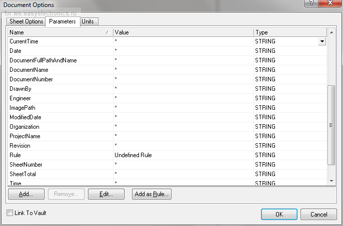 Далее необходимо построить рамку основной надписи, поэтому добавляем надписи и параметры документа. Параметры в схемном редакторе вводятся как "=ИмяПараметра". Значения параметров настраиваются в настройках документа на вкладке «Parameters»: