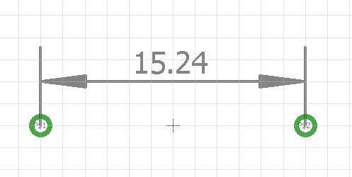Расставляем две контактные площадки для резистора на рабочее поле редактора. Их необходимо поставить симметрично относительно центра (он обозначен белым крестиком). Расстояние, которое должно быть между площадками, необходимо выбирать с учетом длины корпуса резистора и расстояний до места изгиба его выводов. Например, можно взять по 3 мм с обоих сторон от корпуса. Результат представлен на рисунке 2.6.
