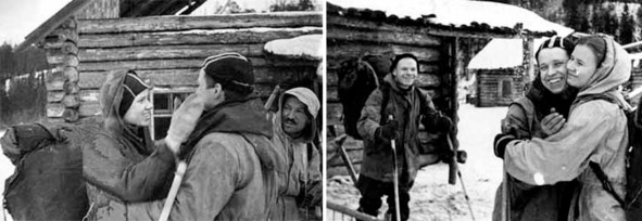 Эти фотоснимки сделаны в первой половине дня 28 января 1959 г.: девушки прощаются с Юрием Юдиным во «Втором-Северном». Без труда угадываются персонажи на задних планах: на левом фотоснимке это Семён Золотарёв, на правом – Игорь Дятлов.