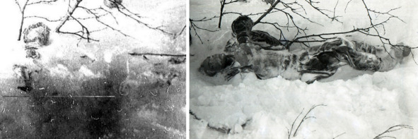 Слева: тело Игоря Дятлова в момент его обнаружения на склоне. Из-под снега торчат только предплечья прижатых к груди рук. Справа: тело Игоря Дятлова после откапывания из снега. При первом же взгляде на фотографию обращают на себя внимание расханутая меховая безрукавка и поза, никак не соответствующая «позе зябнущего человека».