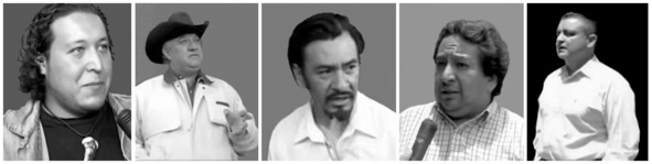 Главные герои невероятной истории поимки инопланетянина. Слева направо: Анхель Паласио Нуньес, батрак, ставивший мышеловки и обнаруживший странное существо, угодившее в одну из них; Марио Морено Лопес, хозяин усадьбы, на территории которой был пойман шныряющий инопланетный засланец; Марио Саласар, ещё один почётный батрак на ранчо; Франциско Гарсия, батрак на ранчо Марио Лопеса; Родольфо Лопес, товарищ и однофамилец владельца ранчо, оказавшийся случайно в доме Марио в день сенсационного происшествия. Вся эта компания разумных на первый взгляд людей на протяжении долгих месяцев рассказывали невероятную историю о поимке и последующем умерщвлении крохотного инопланетянина.