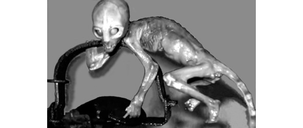 Мелкий гадёныш ростом 15 см., розовокожий и безволосый, издавал отвратительный крик. Его лапа была зажата мышеловкой и таинственная тварь не могла освободиться самостоятельно.